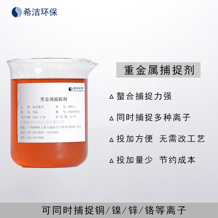 重金属捕捉剂,通常也被叫做重金属捕集剂、重金属螯合剂、重金属离子析出剂,重金属沉淀剂等。是一种能与重金属离子强力螯合的工产品。采用接枝合成工艺,其枝链上的螯合基团能螯合重金属形成稳定不溶物而沉淀。